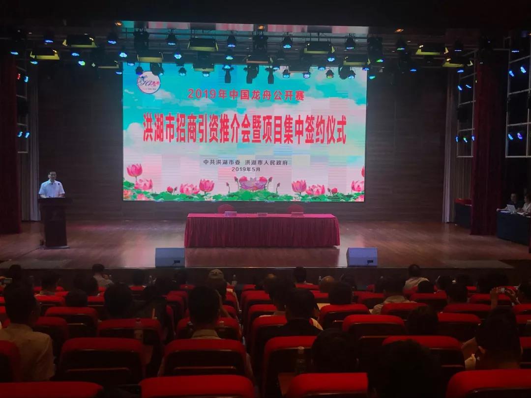 25日-26日,2019年中国龙舟公开赛湖北洪湖站比赛开桨。借此东风,洪湖市招商引资推介会暨项目集中签约仪式顺利举行。签约仪式共邀请了近200位嘉宾和企业家参加。活动当日共签约17个项目,总金额50多亿元。项目涉及生物能源、新材料、机械制造、汽车零部件等方面。