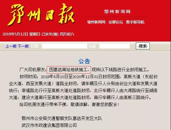 据《鄂州日报》5月初的消息,当地部分路段从2019年5月10日至2020年12月31日进行全封闭施工。