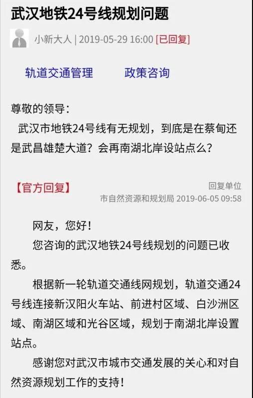 对此,官方回复称:根据新一轮轨道交通线网规划,轨道交通24号线连接新汉阳火车站、前进村区域、白沙洲区域、南湖区域和光谷区域,规划于南湖北岸设置站点。