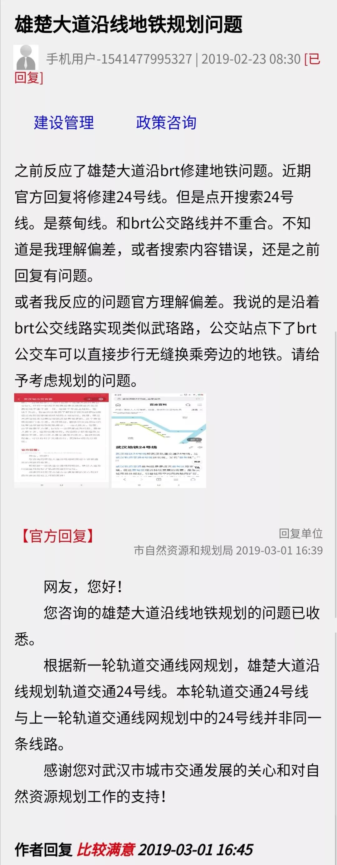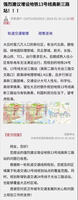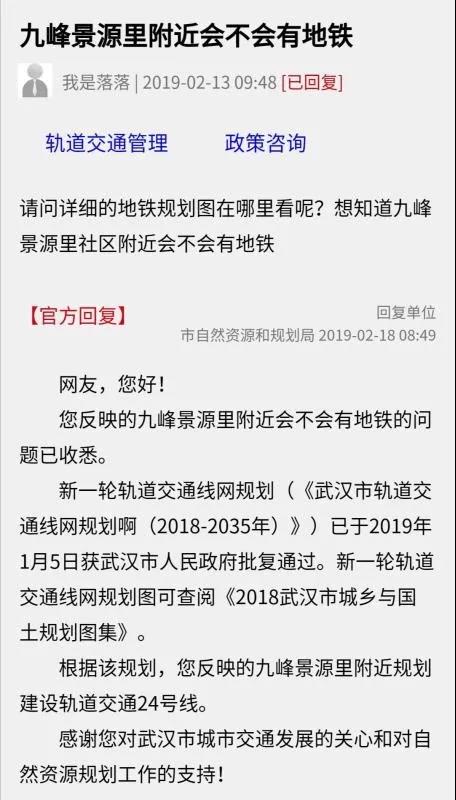 对此,官方回复称,依据新一轮轨道交通线网规划,规划轨道交通24号线由新汉阳火车站至东湖高新区,该线路在葛洲坝世纪花园小区附近设站,能够有效覆盖该小区,满足居民出行需求。