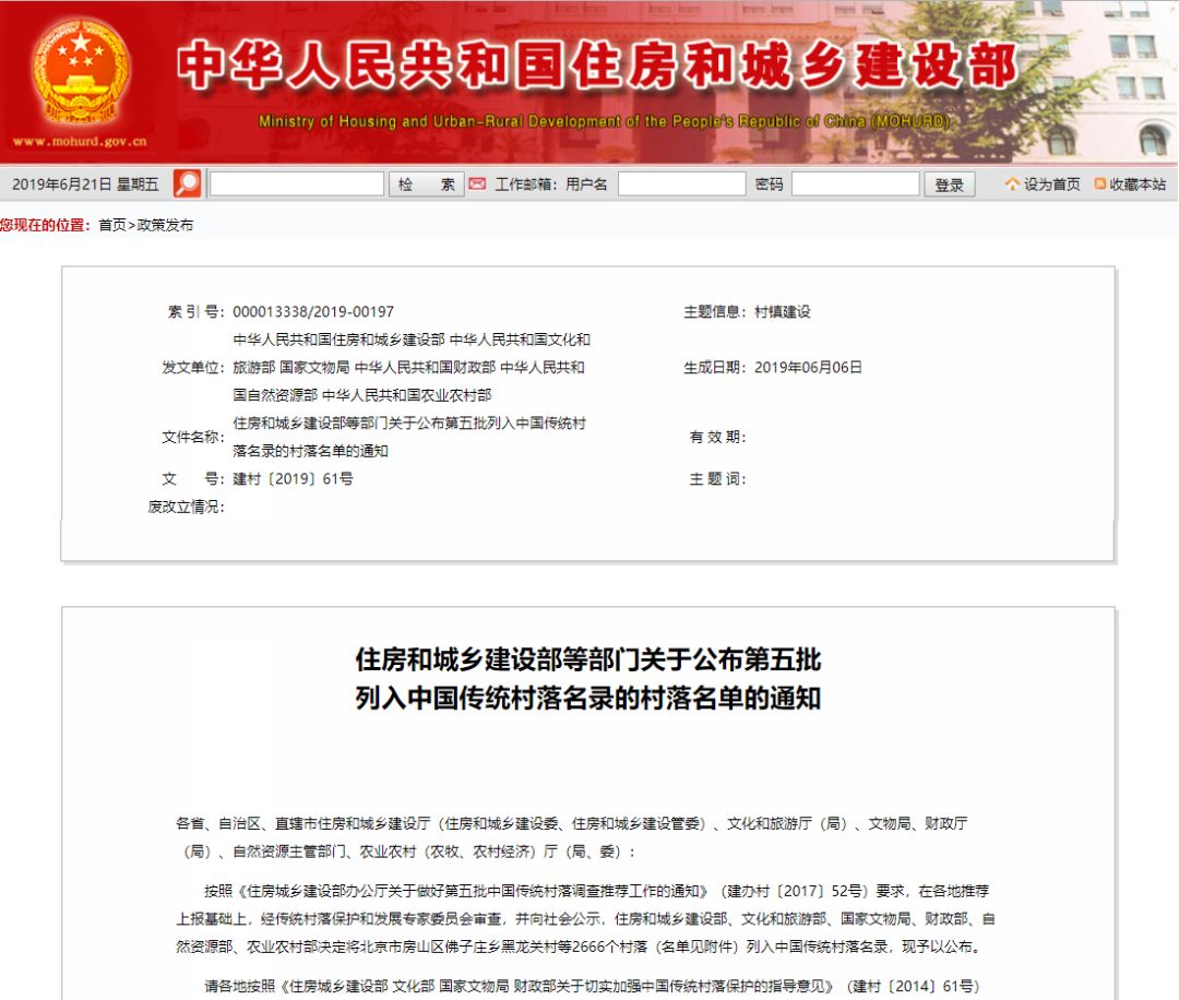 日前,住房和城乡建设部、文化和旅游部、国家文物局、财政部、自然资源部、农业农村部等六部委共同下发通知公布第五批中国传统村落名单。