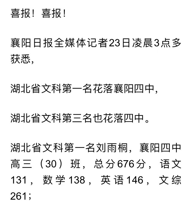 全省文科第一名刘雨桐,襄阳四中高三(30)班,总分676分,语文131、数学138、英语146、文综261。