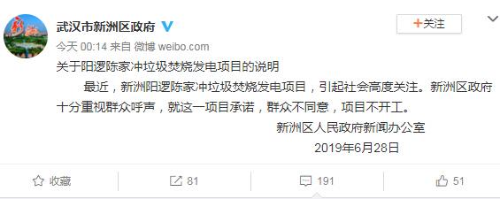 今天凌晨,武汉市新洲区政府在官方微博发文回应“阳逻陈家冲垃圾焚烧发电项目”:“群众不同意,项目不开工”。