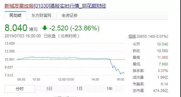 昨日午后,港股新城发展控股闪崩,截至收盘,股价报8.04港元,跌幅超23%。