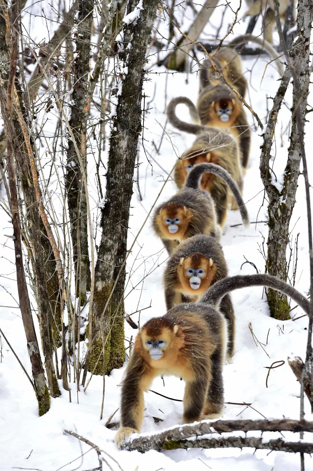金丝猴在神农架大龙潭山林中行走(2016年1月13日摄)。新华社记者杜华举 摄