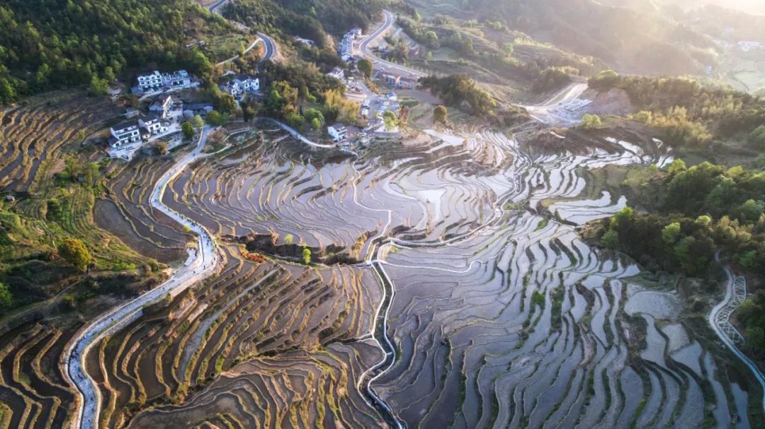 2018年4月10日无人机拍摄的湖北省蕲春县的雾云山梯田,当地利用高山梯田风光,打造农耕文化景区,发展绿色观光农业。新华社记者程敏 摄