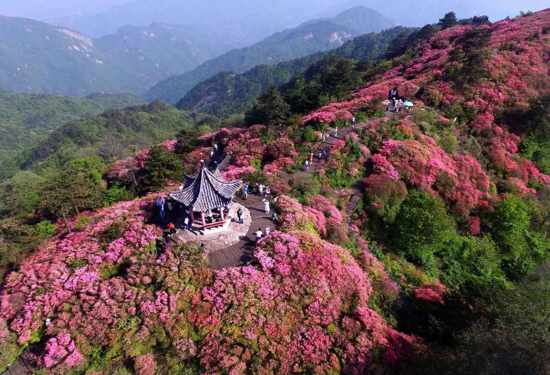 游客在湖北省麻城市龟峰山的杜鹃花海中游玩(2016年4月29日无人机拍摄)。新华社记者程敏 摄