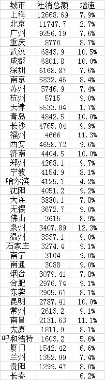 相比之下,增速较慢的城市有不少来自北方,其中,天津增幅仅为1.7%,北京为2.7%,哈尔滨为4.2%。除北京之外,其他东北、华北地区城市的社消总额增速放缓,主要是与近年来能源经济下行、区域经济增速放缓有关。