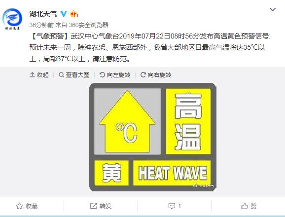 【气象预警】武汉中心气象台2019年07月22日08时56分发布高温黄色预警信号:预计未来一周,除神农架、恩施西部外,我省大部地区日最高气温将达35℃以上,局部37℃以上,请注意防范。