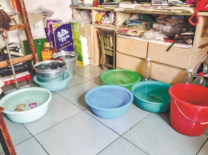 在5楼漆爹爹的家里,客厅地面摆放了七八个装满水的塑料盆,厨房里的锅碗瓢盆也几乎都装满了水。“总是停水,都怕了。”漆爹爹说,只要一来水他就把所有能储水的容器都装满水,生怕再次遭遇停水。