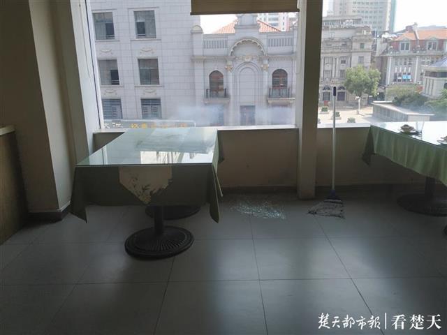 随后,记者在三楼顺香餐厅看到,靠近破损玻璃墙附近的一张餐桌旁,地面堆积着不少钢化玻璃碎渣。一位服务员称,店老板还没来,今日早晨9时,她来店里上班时发现,店内靠墙的餐桌、地面、椅子上有大量玻璃碎渣,她进行了初步的清扫。
