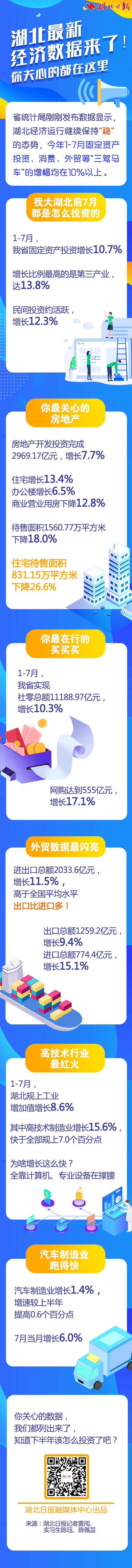 湖北省统计局19日发布最新经济数据显示,湖北经济运行继续保持“稳”的态势:工业增长稳中趋缓,投资结构持续优化,消费市场总体平稳,财政收入保持增长,金融物价总体稳定,进出口增长较快。今年1-7月固定资产投资、消费、外贸等“三驾马车”的增幅均在10%以上。