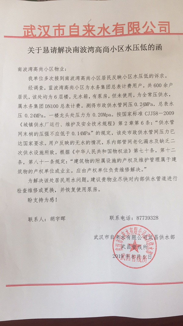 钱姓业主向澎湃新闻提供一份“关于恳请解决南波湾高尚小区水压低的函”的文件,该文件盖有武汉市自来水有限公司武昌供水部武昌管线所红章,落款日期为2019年8月5日。该文件显示,经调查,南波湾高尚小区为水务集团总表计费用户,共600余户居民,该处均为6层楼,无水箱,有泵房,但未使用,为全常压供水,属水务集团DN100总表计费。测得市政供水管网压0.24Mpa,总表水压0.24Mpa。一楼龙头处压力为0.20Mpa。按国家标准CJJ58-2009《城镇供水厂运行、维护及安全技术规程》第2章第6条:“供水管网末梢的压强不应低于0.14Mpa”的规定,该处市政供水管网压力已达国家要求。