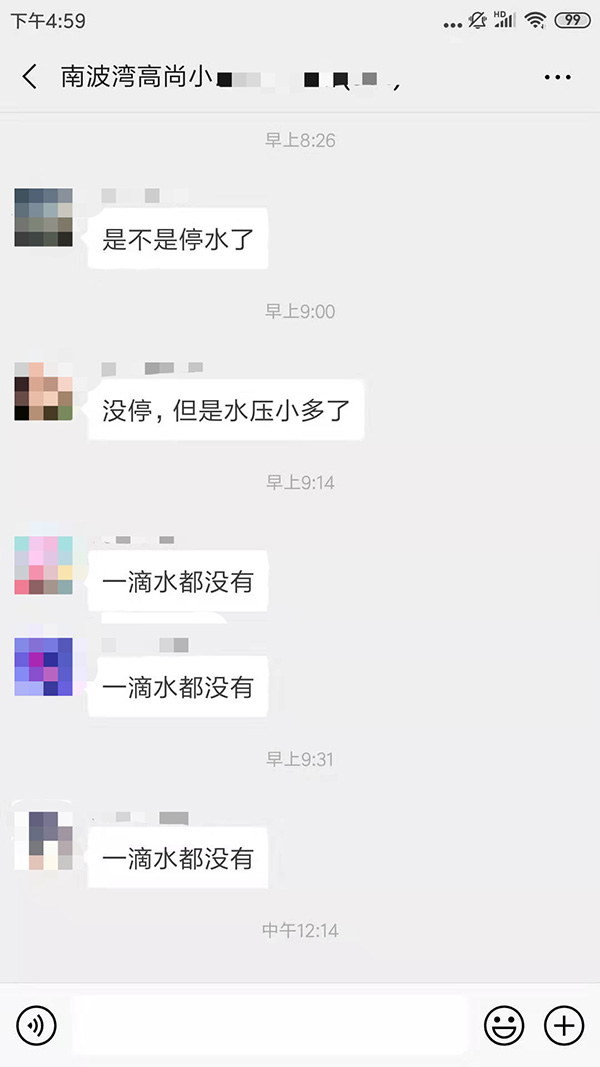 根据钱姓业主提供的一张小区业主微信群聊截图显示,多名疑似小区住户反映“一滴水都没有。”