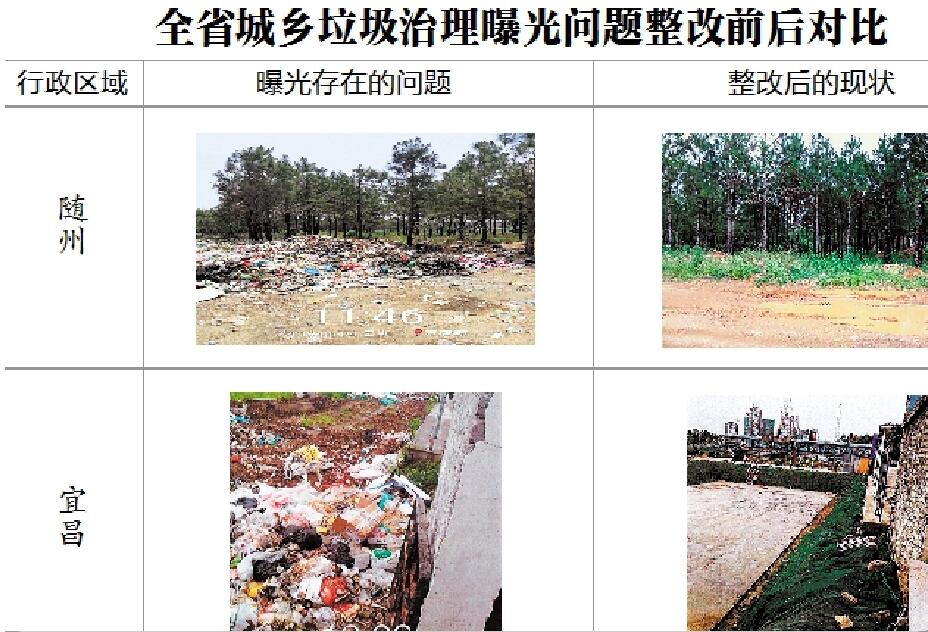 问题曝光后,襄阳、孝感、随州、咸宁、宜昌、黄石、十堰、天门等地城乡垃圾治理主管部门积极应对,坚持问题导向,主动排查问题,举一反三,迅速开展集中整治行动,已将长期暴露的垃圾基本清理整改完毕。