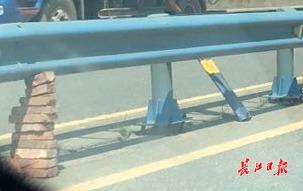 除了桥梁接缝无人处理,桥面中央的隔离护栏也多处变形。其中,盘龙大桥东西湖至黄陂方向的上桥处的一段隔离护栏,变形严重,近20个护栏基座也已经与桥面分离,基座与桥面之间缝隙已有约5厘米,而其处理方式也显得漫不经心——直接用一层层的砖头摞成约40厘米高的底座,支撑住护栏。记者注意到,这种由砖头摞成的底座有三处。