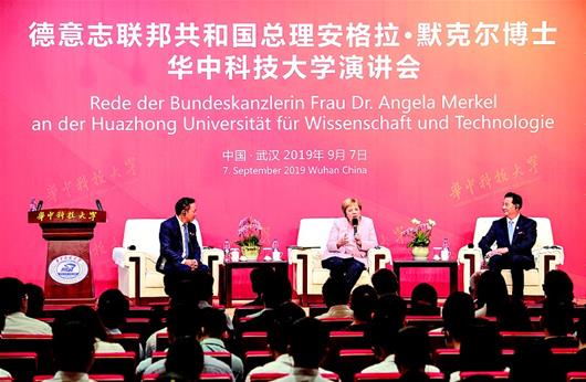 图为:9月7日,德意志联邦共和国总理默克尔,访问湖北武汉,并在华中科技大学发表演讲,与师生代表交流。
