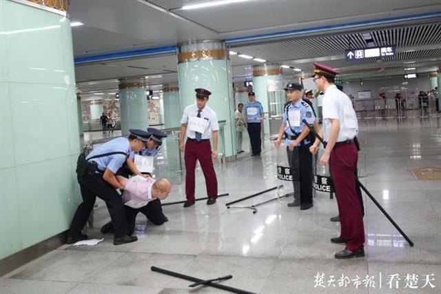 轨道交通3、6号线东风公司站内,当天上午9时许,记者现场看到2名“暴恐分子”嫌疑人携带“刀具”试图进站,被安检发现后实施了暴力恐怖行为,从腰中掏出刀具“砍伤”安检员。现场工作人员发现后,手操防暴器具与“暴恐分子”搏斗,同时迅速向地铁公安报告。2分钟内,十多名工作人员和地铁公安齐力将2名“暴恐分子”制服。