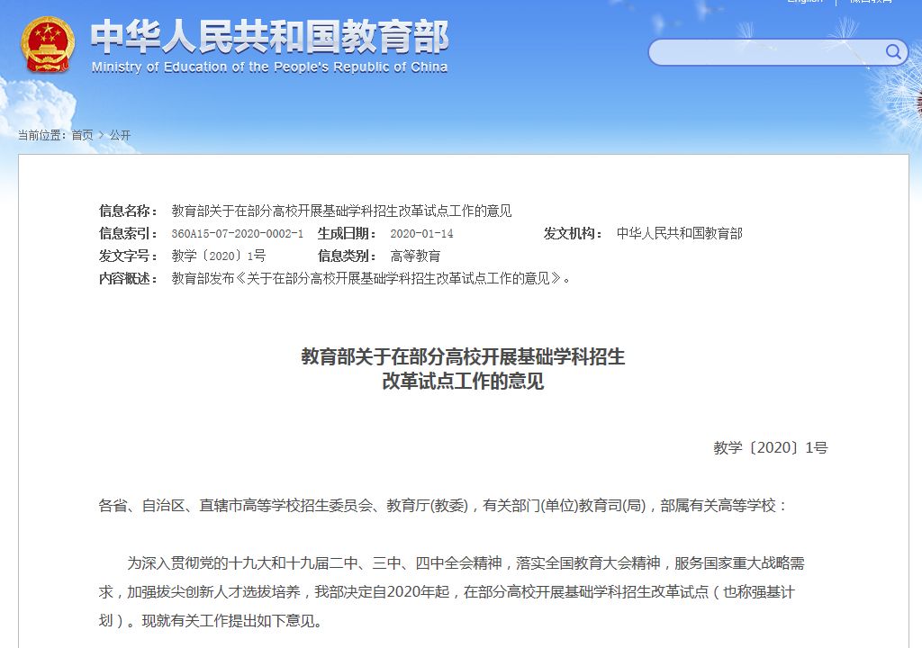 今天教育部官网发布《关于在部分高校开展基础学科招生改革试点工作的意见》,决定自2020年起,在部分高校开展基础学科招生改革试点(也称强基计划)。
