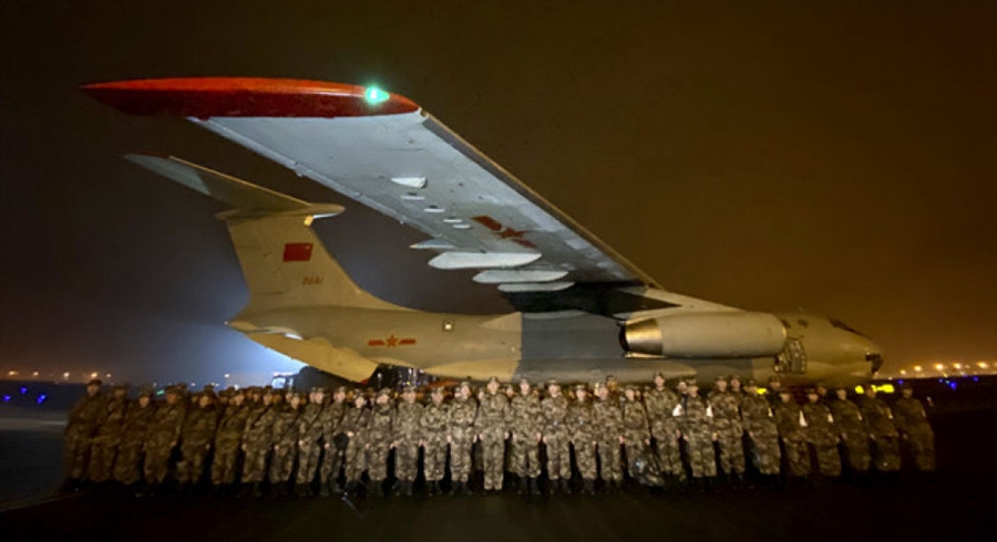 1月24日晚,由陆军军医大学抽调精干医务人员组建的医疗队在重庆江北国际机场停机坪集结,准备连夜驰援武汉。新华社发