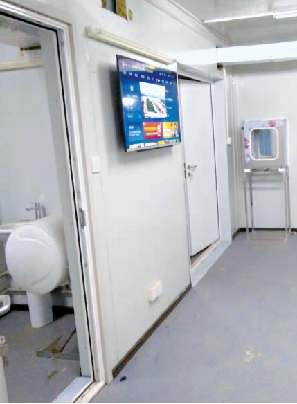 记者看到,每两个病房组合一个套房。从内走廊进去,是为医护人员准备的的工作间,然后两边是两个病房,每个病房布置两张病床。每个病房有一个单独的小窗口,还有一个玻璃窗。正对外面走廊也有一个窗户。病房里的空调,窗口设施、消毒设备全部安装到位。每个病房有一个卫生间,每个卫生间都装有热水器。