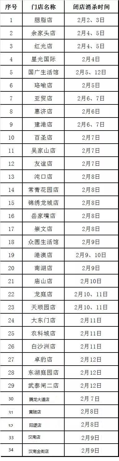 武商超市相关负责人介绍,为了对顾客和员工的健康负责,武商超市将陆续进行全面消杀工作,由专业消杀公司负责,包括空调、门窗、卫生盲区等。从2月3日开始,每家店消杀时间为1—2天,此项工作将一直持续至2月10日。同一片区不会同时关闭所有门店,保证顾客有就近购物的选择。超市物资供应充足,市民不必囤积。