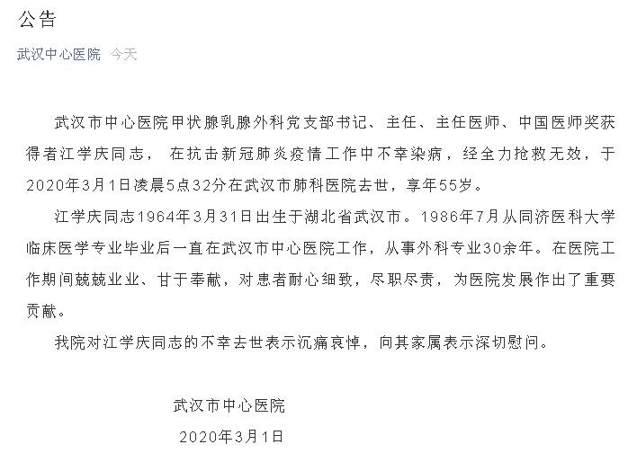武汉市中心医院甲状腺乳腺外科党支部书记、主任、主任医师、中国医师奖获得者江学庆同志,在抗击新冠肺炎疫情工作中不幸染病,经全力抢救无效,于2020年3月1日凌晨5点32分在武汉市肺科医院去世,享年55岁。