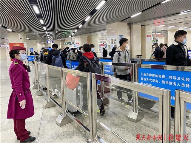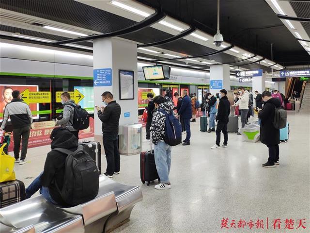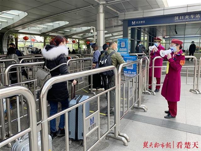 “乘客您好,一路辛苦了,请您自觉排队,保持安全距离。为维护公共安全,请自觉扫码乘车……”4月1日上午9时许,随着多个车次抵达汉口火车站,汉口火车站地铁站客流增加。铁路、地铁工作人员及时联动,将积压客流引导至火车站站前广场,在广场通往地铁站E口的进站通道处循环播放提示广播,值班站长熊金金则带领多名工作人员引导乘客提前完成实名认证、扫描进站码后出示绿码状态,乘客有序通过E口外的回形栏杆迂回进站。