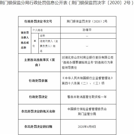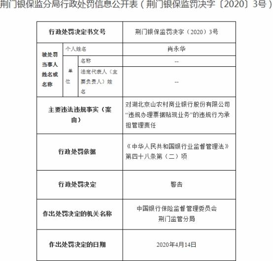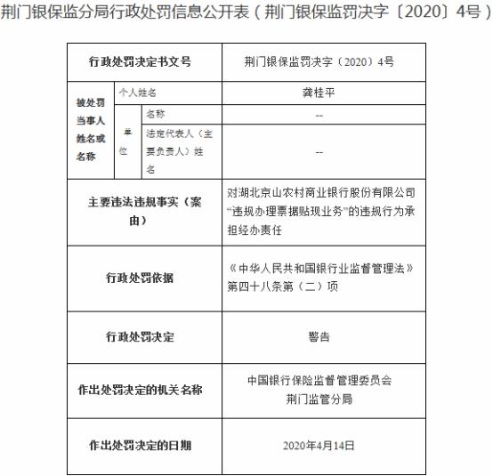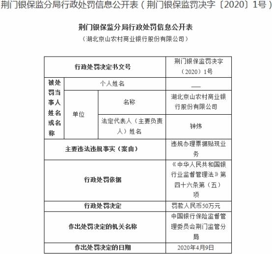 银保监会网站昨日发布荆门银保监分局行政处罚信息公开表(荆门银保监罚决字〔2020〕1号、2号、3号、4号)显示,湖北京山农村商业银行股份有限公司(以下简称“湖北京山农商行”)存在违规办理票据贴现业务行为,银保监会荆门监管分局对其罚款50万元,行政处罚依据为《中华人民共和国银行业监督管理法》第四十六条第(五)项。