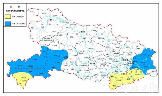 此外,预计三峡库区巴东县、秭归县及夷陵区,恩施州城区及建始县、利川市、宣恩县北部、鹤峰县,宜昌市城区及长阳县、五峰县,鄂州市鄂城区,黄石市城区及大冶市北部,黄冈市黄州区、团风县、罗田县、英山县、浠水县、蕲春县、武穴市西部和北部及黄梅县北部等地质灾害高易发区和部分中易发区,受降水影响引发崩塌、滑坡、泥石流等突发性地质灾害有一定风险,为蓝色预警。