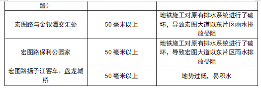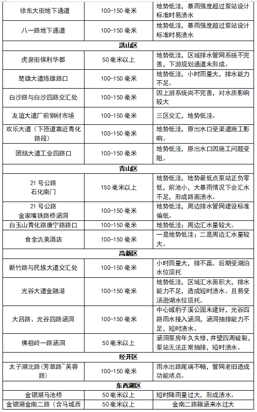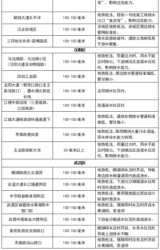 武汉市水务局今年根据雨情及排水设施情况,修订了渍水点风险图,中心城区(含东西湖区)主次干道共有59处易渍水(风险)点,其中,高风险渍水点8处(大于50毫米强降雨时),中风险渍水点45处(100-150毫米强降雨时);低风险渍水点6处(150毫米以上降雨时)。