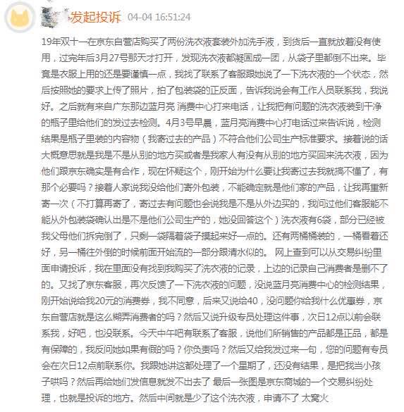 近日,消费者王女士在第三方投诉平台举报称,其在蓝月亮某网络平台旗舰店购买的洗衣液,打开后发现已凝固成一团,经蓝月亮检测为不合格商品;由于王女士购买后并未第一时间使用,蓝月亮检测为不合格商品后,反质疑她购买的问题商品并非出自官方旗舰店。