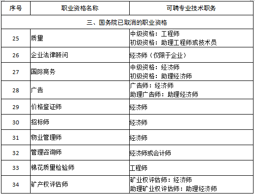 《通知》还明确,国务院清理规范职业资格前,通过全国统一考试,取得质量、企业法律顾问、国际商务、广告、价格鉴证师、招标师、物业管理师、管理咨询师、棉花质量检验师、矿产权评估师等10项职业资格证书的人员,原职业资格证书继续有效,可直接对应相应系列和层级的职称,两者享受同等效力。
