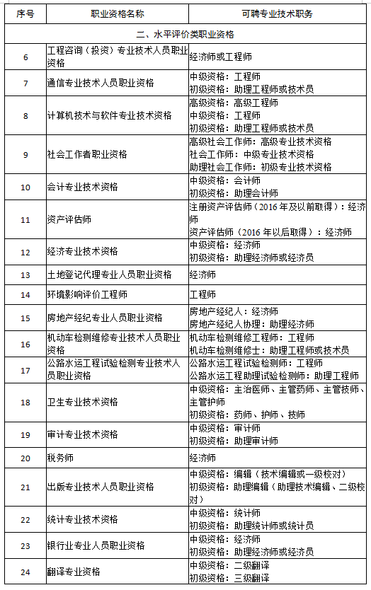 《通知》明确,通过全国统一考试,取得监理工程师、注册设备监理师、执业药师、护士执业资格、执业医师资格、工程咨询(投资)专业技术人员职业资格、通信专业技术人员职业资格、计算机技术与软件专业技术资格、社会工作者职业资格、会计专业技术资格、资产评估师、经济专业技术资格、土地登记代理专业人员职业资格、环境影响评价工程师、房地产经纪专业人员职业资格、机动车检测维修专业技术人员职业资格、公路水运工程试验检测专业技术人员职业资格、卫生专业技术资格、审计专业技术资格、税务师、出版专业技术人员职业资格、统计专业技术资格、银行业专业人员职业资格、翻译专业资格等24项专业技术类职业资格证书的专业技术人员,其职业资格直接对应相应系列和层级的职称,两者享受同等效力。