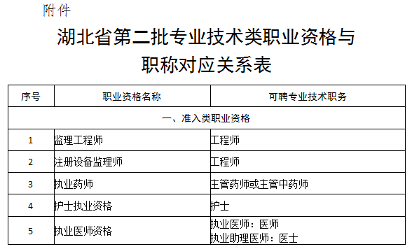 为深入推进职称制度与职业资格制度有效衔接,进一步减少重复评价,降低社会用人成本。近日,湖北省人社厅印发了《关于建立第二批专业技术类职业资格与职称对应关系的通知》,在我省已建立的首批13项专业技术类职业资格与职称对应关系基础上,继续建立第二批34项专业技术类职业资格与职称对应关系,明确这些专业技术类职业资格效力直接等同于职称。