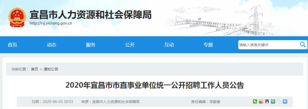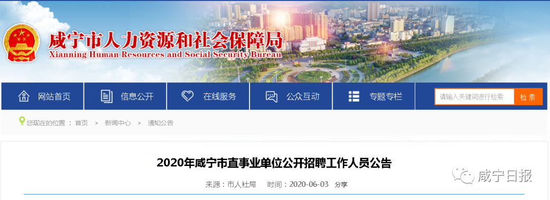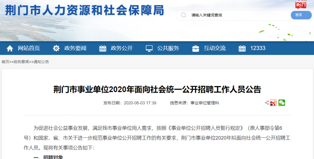 6月3日,荆门市人社局发布荆门市事业单位2020年面向社会统一公开招聘工作人员和统一专项公开招聘高校毕业生公告。