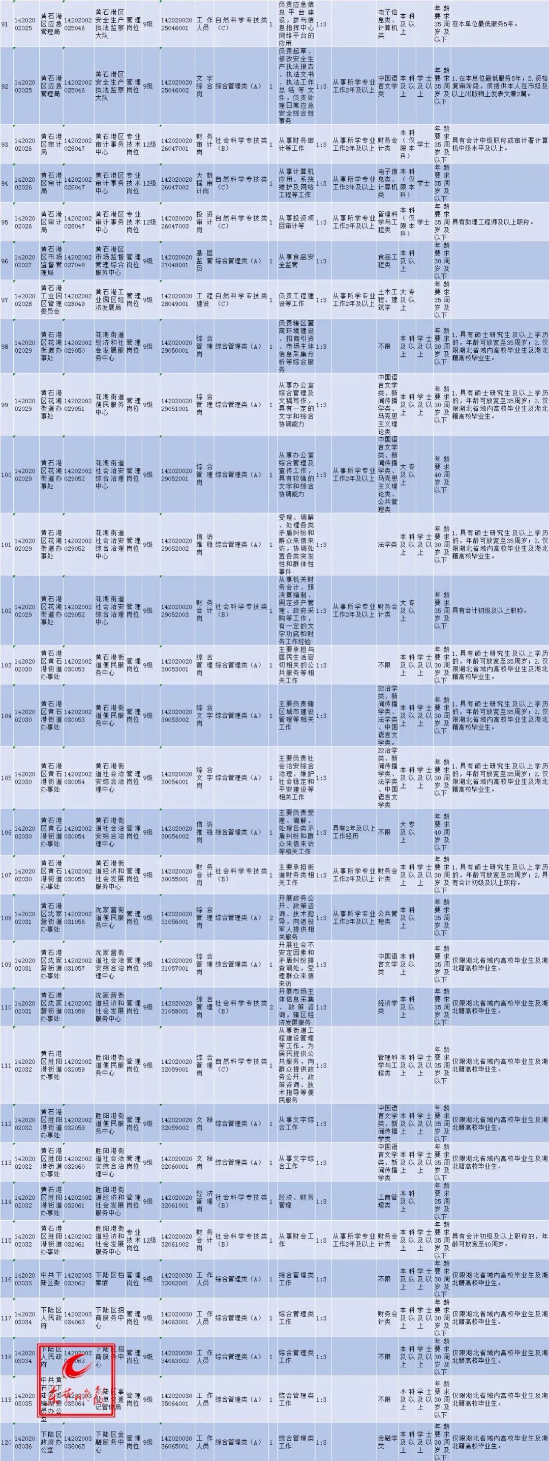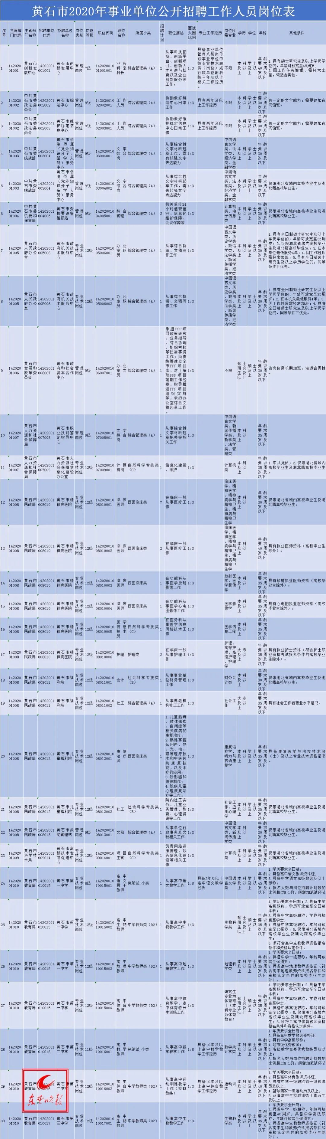 点击查看黄冈市直事业单位2020年统一组织公开招聘工作人员岗位表