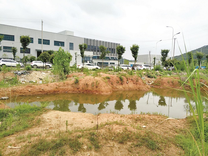 11日下午,记者来到园区三路,吞噬孩子的水坑就在工厂大门对面,两个地方只隔着一条马路,相距只有20多米。水坑四周的土地显然经过平整,但尚未开发使用。