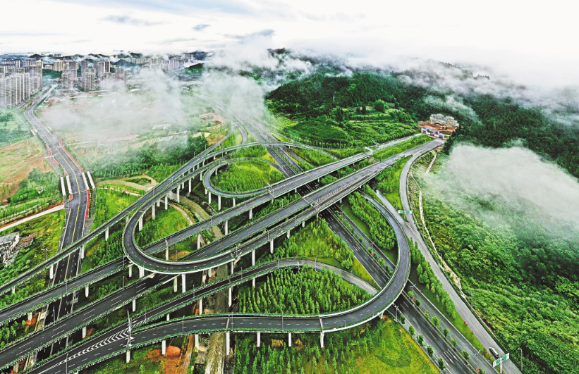 6月13日,在晨雾的掩映下,宜昌市夷桥路与江城大道互通立交桥显得格外壮观,建设中的宜昌江南大通道初具雏形。