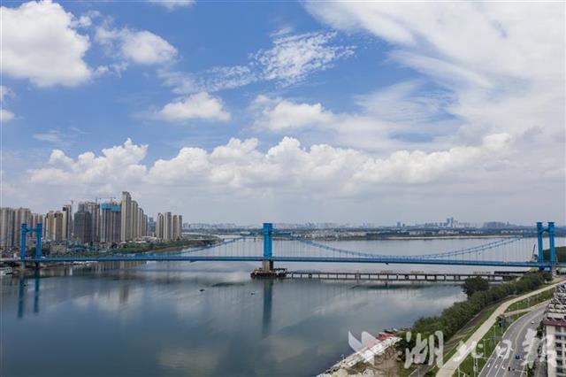 远远望去,这座蓝色三塔悬索桥十分雄伟壮观。该桥是汉江首座三塔式悬索桥,也是湖北境内继武汉鹦鹉洲长江大桥后第二座三塔悬索跨江桥。