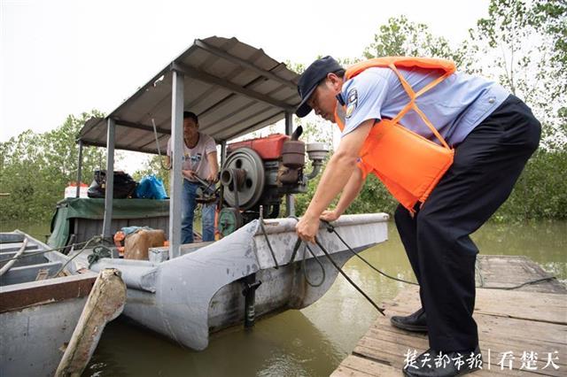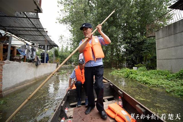 中午12点半,匆匆吃完盒饭的余咏喜和王思顺再次上船,这次他们不仅要巡逻,还要和天兴乡政府工作人员一起为岛内驻守的工作人员运送发电机和应急物资。今年56岁的民警王思顺在天兴派出所工作了18个年头,回想起2002年那次天兴洲行洪还历历在目,作为一名社区民警,一路上他总会仔细查看过往的民房,谁家的房子新,谁家的房子可能有隐患,他都心里有数。