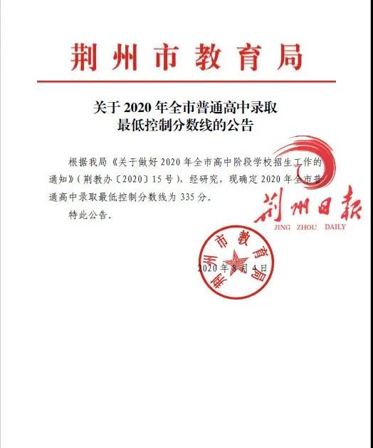 今天下午,荆州市教育局公布了2020年普通高中录取最低控制分数线为335分,中考分数达到335分才能上高中,分数没有达到335分的考生可报读中职学校。今年最低录取控制线比去年高出35分!