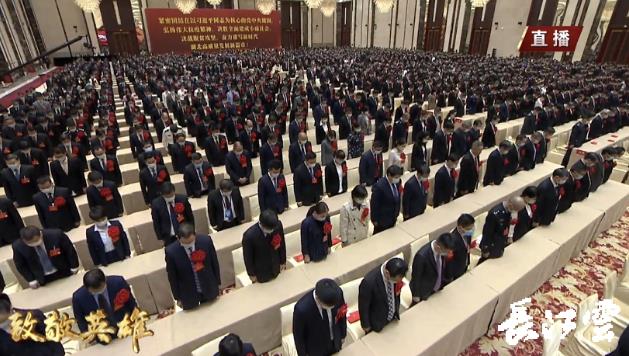 在抗击疫情的严峻斗争中,一批医务人员、干部职工、社区工作者等因公殉职,许多患者不幸逝世。表彰大会上,全场肃立,向新冠肺炎疫情牺牲烈士和逝世同胞默哀。