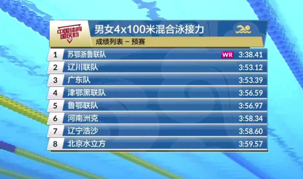 苏鄂浙鲁联队联手打破男女4X100米混合泳接力世界纪录