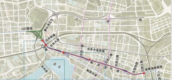 该工程西起三环线额头湾立交,东至汉西三路,全长约5.98公里,估算总投资约40亿元。全线采用高架加地面辅道的建设形式,主线采用双向4至6车道,辅道双向4至6车道。在古田一路、古田四路及解放大道共设有3对匝道,远期结合古田二路快速化改造,预留古田二路互通立交一处。