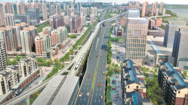 穿过轻轨后,高架桥距离轻轨线路仅1米左右,这样需平行行进约800米。“狭窄的施工环境,对我们施工效率和文明施工都提出了更高的要求。”