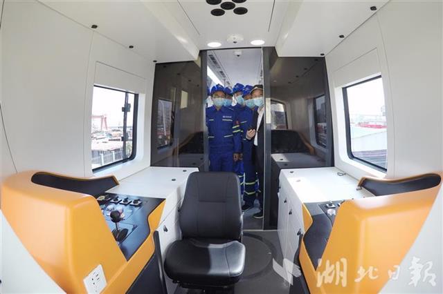 图为:“新时代号”空中轨道列车行驶过程中,驾驶舱内空无一人,技术人员站在驾驶舱门口观察。