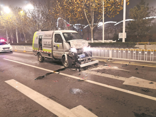 当晚8时43分,方某酒后驾驶环卫作业车沿洪山区黄鹤路行驶,行至高铁西二路路口时,见前方车辆排队等候信号灯,他本该踩刹车,由于意识不清醒误踩了油门,导致环卫车撞上前方出租车,出租车又撞上前方黑色小车,发生三车连环追尾交通事故,造成三车受损、两人轻微受伤。洪山交警迅速赶到现场处置,将方某带至医院进行抽血检测,认定其醉驾。
