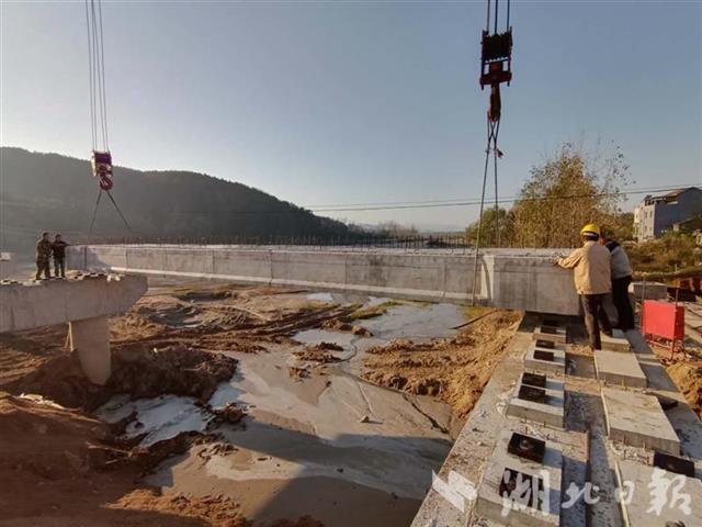 11月18日,麻城市三河口镇吊机轰鸣,工人们正在运梁架桥——举水河支流上的黄土咀桥在被鉴定为四类危桥后被拆除,原址上正在重建166米长、9米宽的新桥。