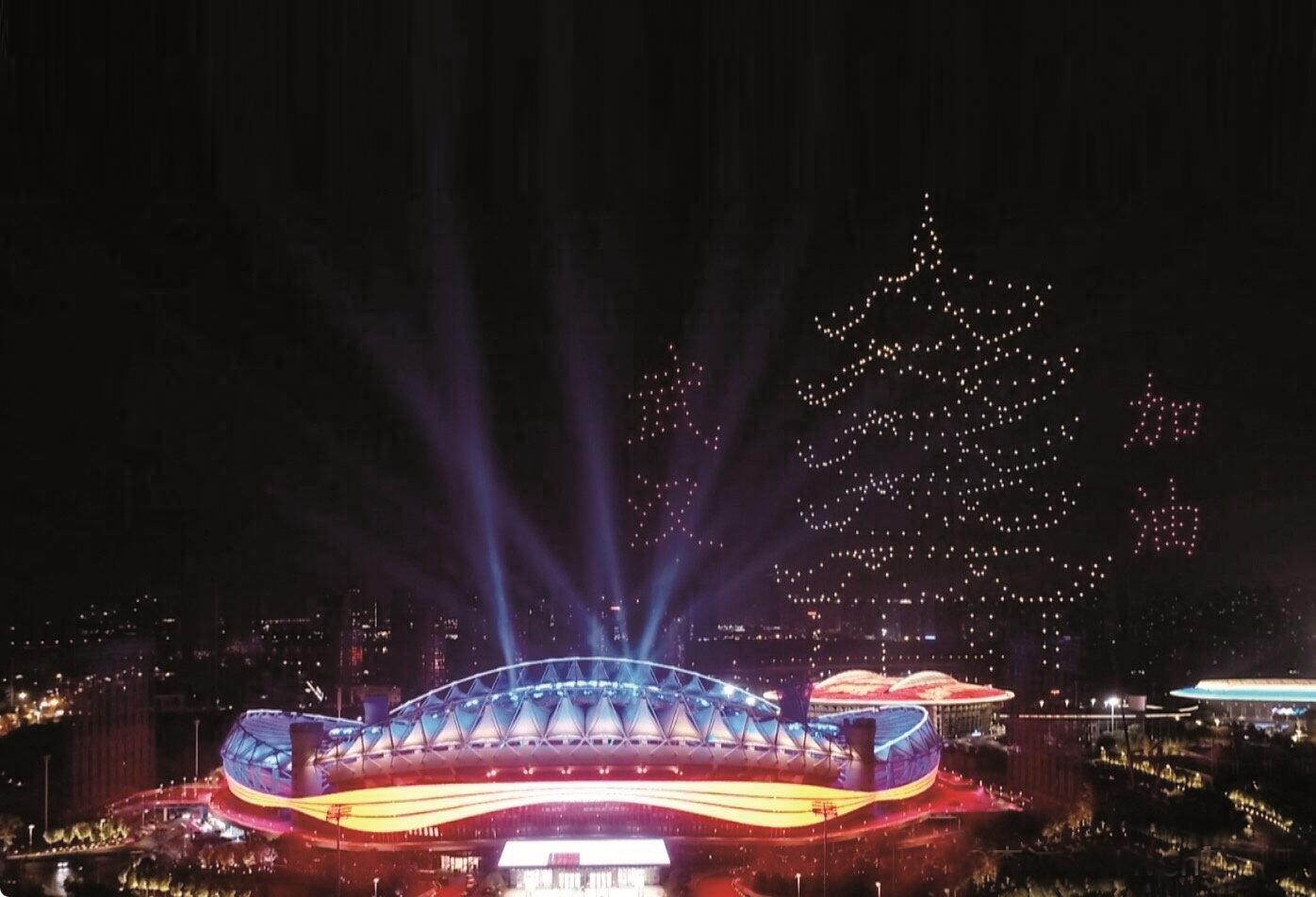 体育场外,1000架无人机编队表演,除了打出“好声音唱响武汉,新未来致敬英雄”的对联外,黄鹤楼的经典形象,四位导师和主持人华少的画像也次第被拼出。